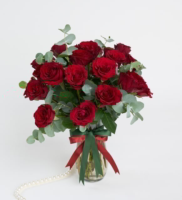 Sessiz bir itirafın, kalp atışlarıyla ölçülen bir anın rengi. Kırmızının derinliğinde saklanan duygu, berrak camın içinde ağır ağır yükselir. Her bir gül, birlikte geçirilmiş zamanların hafif bir yankısı; kıvrılan yapraklar, zarif bir ritim gibi.