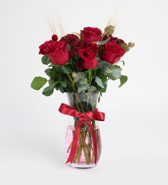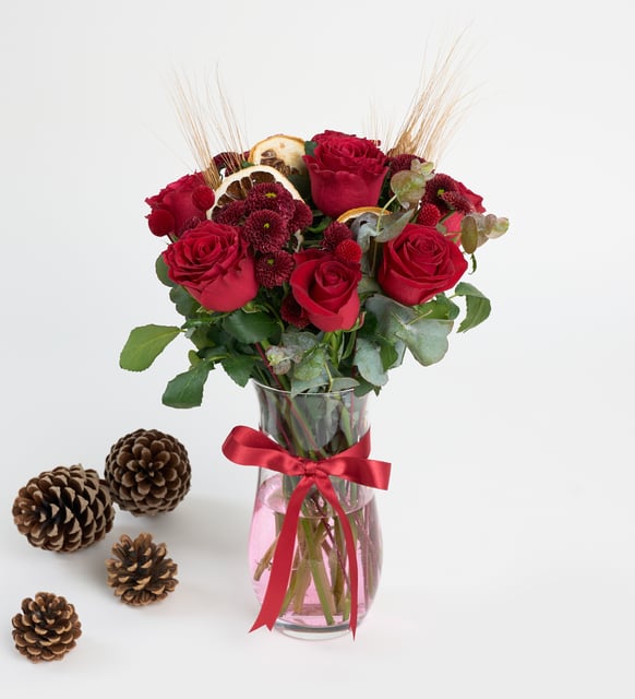 Sessizliğin içinde bir kırmızılık… Yedi gül, kristal bir silindirde tek bir duyguya dönüşüyor. Craspedia’nın yuvarlak ritmi, bordo top krizantemin derin tonu ve buğday başaklarının ince altın çizgisi, aranjmana dingin bir denge getiriyor. Okaliptüs dallarının serin kokusu mekana hafif bir ferahlık yayarken, narenciye notasını taşıyan kurutulmuş limon parçası bütün kompozisyona sakin bir canlılık katıyor. İnce kırmızı kurdele, bu duru cam form üzerinde zarif bir vurgu olarak kalıyor.
