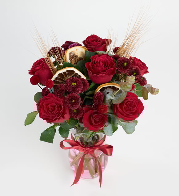 | Süsleme | Kırmızı kurdele, kurutulmuş limon, başak buğdayı, bordo top krizantem ve okaliptüs dalları. |