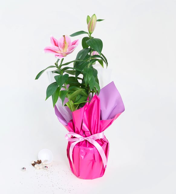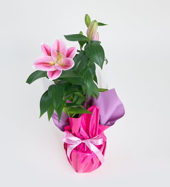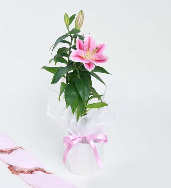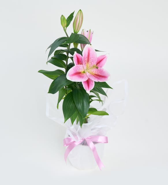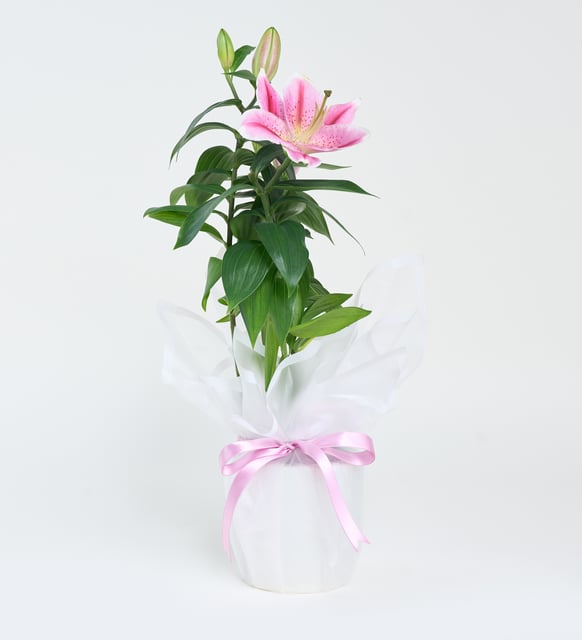 Lila Pembe Buketli Beyaz Polimer Saksıda Pembe Lilyum