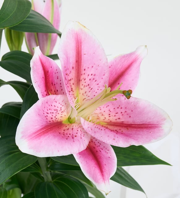 - Beyaz saksı ile pembe lilyumların kontrastı, mekana dinginlik ve ölçülü bir canlılık katar.