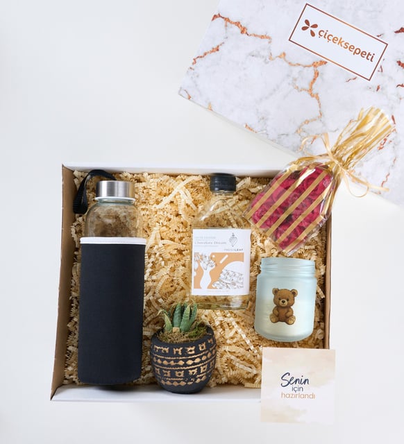 Bordo bir kutunun içinde, günün hızını yavaşlatan küçük ritüeller saklı. Cam matarada ışığın kırılışı, çikolatalı kolonyanın ferah ve sıcak notaları, küçük bir sukulentin dingin nefesi, ayıcık mumun yumuşak silueti. Yanında, beyaz kokolin ile hazırlanmış beşli kekin tatlı bir ara vaadi. Krem renkli kırpık kâğıtların arasında özenle yerleşen bu parçalar, kutu kapağındaki Senin için hazırlandı mesajıyla kişisel bir an’a dönüşür.