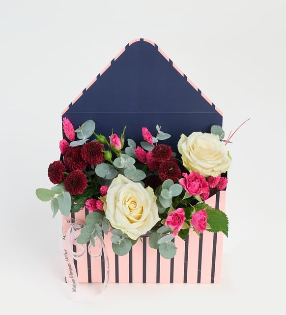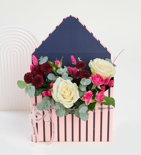Mor çizgili zarf formunun içinde, beyaz güllerin dingin ışığı ile bordo top kasımpatının derin vurgusu buluşur. Aralara serpişen okaliptus dalları ferah bir nefes taşır; pembe çardak güller ve pembe kuş otu, kompozisyona yumuşak bir romantizm ekler. Şeffaf kurdele, tüm bu birbirine fısıldayan tonları zarifçe bir arada tutan sakin bir bağ gibi.
