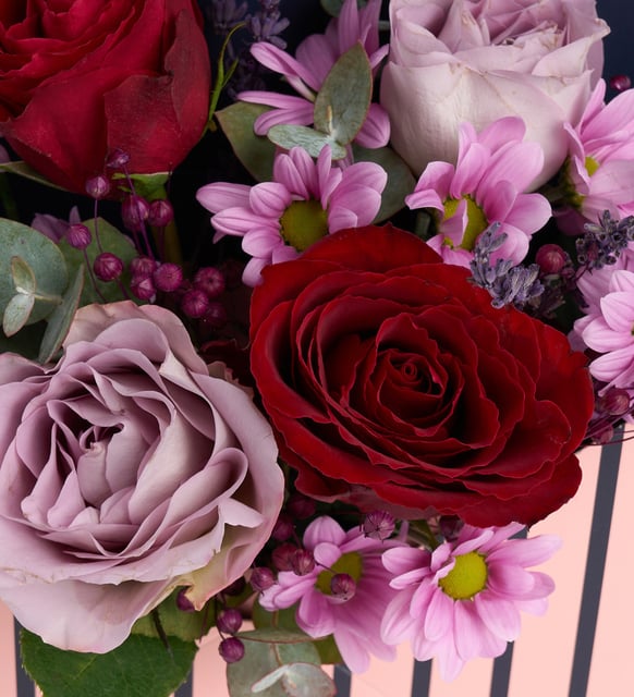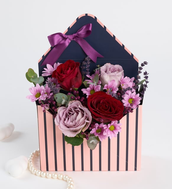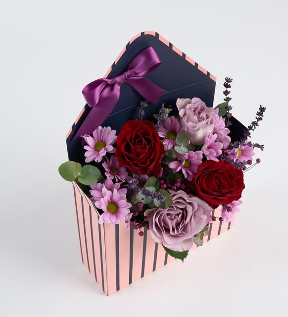 Mor çizgili bir zarfın içinde, renklerin sessizce birbirine karıştığı bir an. Kırmızının sıcak nabzı, lilanın dingin soluğu, pembenin taze gülümsemesi. Arada lavantanın yumuşak kokusu ve mor luna çiçeklerinin mor öyküsü; okaliptusun ferah izleri her dokunuşa sakinlik taşıyor. Zarif bir mor kurdele, tüm bu duyguları usulca bir araya getiriyor.