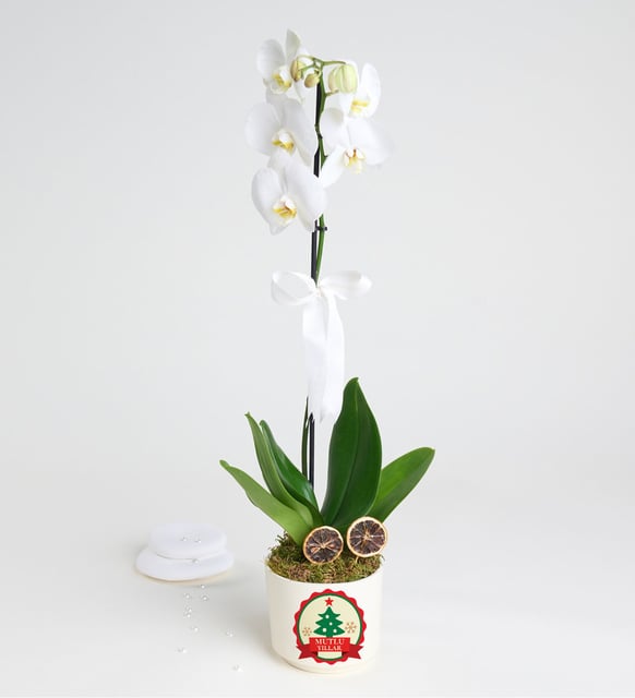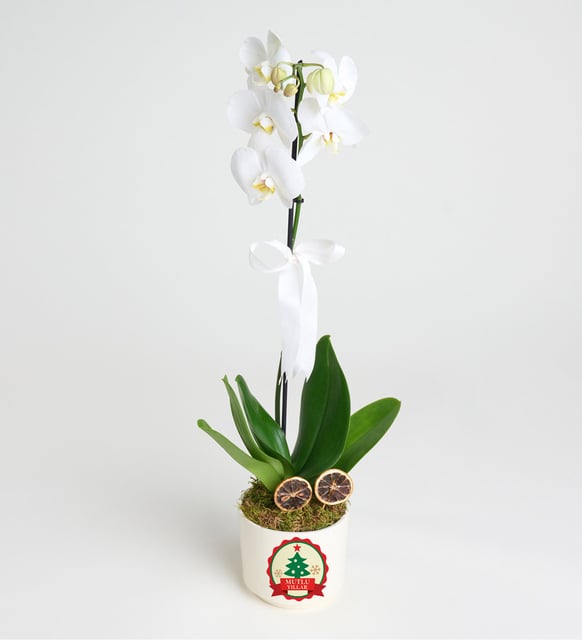 Yeni yılın eşiğinde, beyazın dinginliği tek bir dalda toplanır. Bu zarif orkide, seramik saksısında taşıdığı Mutlu Yıllar mesajıyla, içten bir dileğin sakinliğini odada yumuşak bir ışık gibi dolaştırır. Beyaz kurdele ve kurutulmuş limon detayları, kış güneşinin tatlı parıltısını hatırlatan küçük dokunuşlar olarak kompozisyona hafif bir ritim ekler.