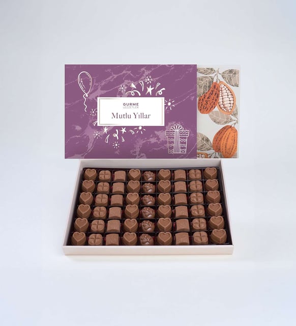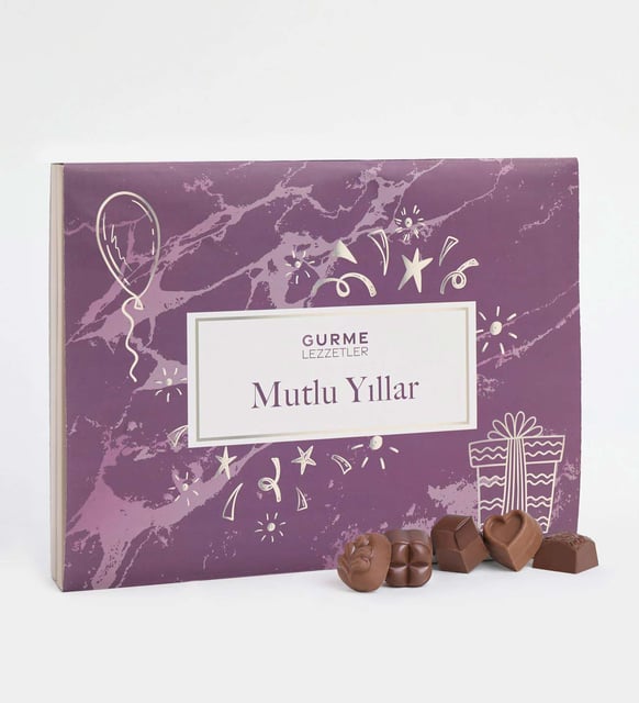 Yeni yılın eşiğinde, palmiye desenli zarif bir kutunun içinden sessiz bir kutlama yükselir. Sütlü notların yumuşaklığı, kalp ve kare formların düzeniyle buluşur; her parça, yılın en güzel anlarını küçük molalara dönüştüren sakin bir tat gibi. İçindeki mesajlı kılıf, “Mutlu Yıllar” dileğini telaşsız bir sıcaklıkla taşır; paylaşımın inceliğini, küçük sürprizlerin dingin sevincini hatırlatır.