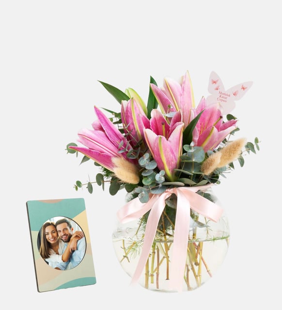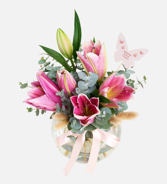 Mutluluk Kanat Çırpsın Pembe Lilyum Cam Vazo Aranjmanı
