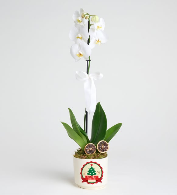 Mutlu Yıllar Mesajlı Saksıda Beyaz Tek Dal Orkide
