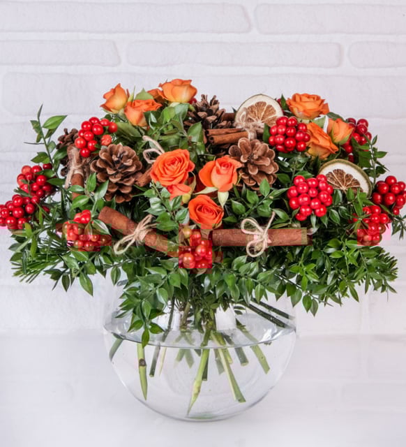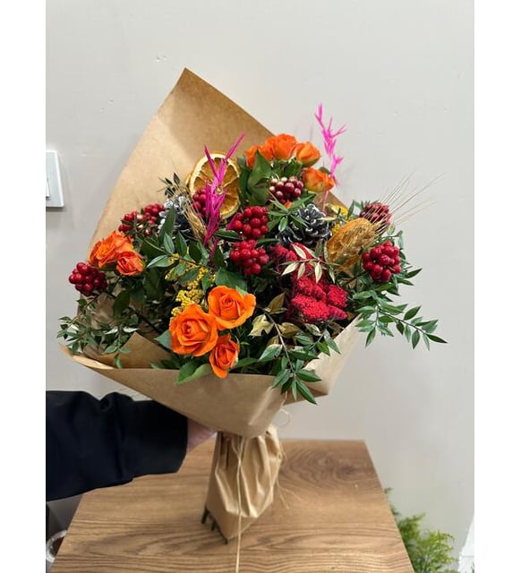 Kraft Bukette Turuncu Güller ve Yılbaşı Kokina Çiçeği (50 cm)