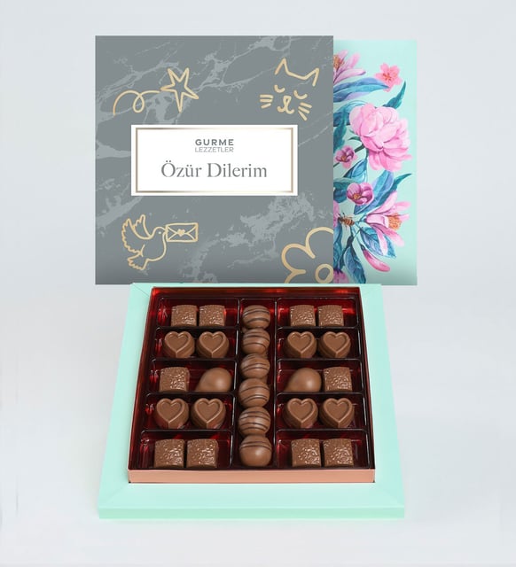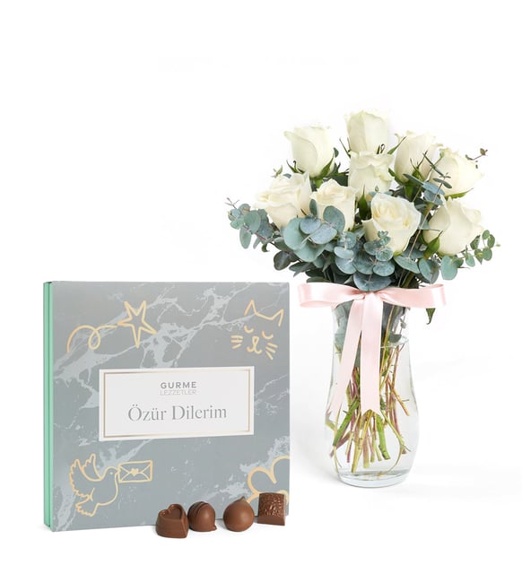 Beyaz güllerin dingin ışıltısı, söylenmesi güç cümleleri yumuşatır. Okaliptusun serin nefesi, içe çekilen her anı hafifletir. Şeffaf cam silindir, bu sessizliği sakince taşır; açık pembe kurdele, kalbin titreyen yerinde ince bir iz bırakır. “Özür Dilerim” yazılı gurme kutusunun tatlılığı, kelimelerin hafifçe geri çekildiği yerde nazik bir köprü kurar.