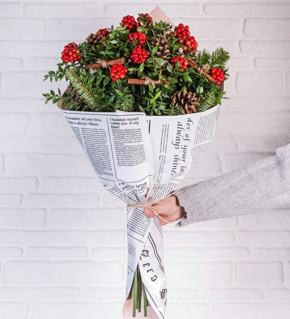 Pembe Gazete Buketinde Kokina Yılbaşı Çiçeği