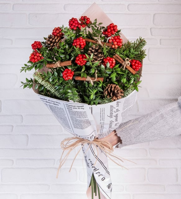Kışın en sessiz anlarında, ince bir ip etrafında toplanan kırmızı meyveler kadim bir fısıltıyı hatırlatır. Kokina, çamın derin yeşili, tarçının sıcak kokusu ve kozalakların doğal dokusuyla buluşurken, pembe gazete buket kağıdı ve burlap ip bu küçük ritüeli zarafetle taşır. Nostalji ile yeniliğin aynı anda hissedildiği bir an gibi; tanıdık bir gelenek, taze bir mevsime açılır. İnanışa göre bu kırmızı meyveler iple bağlandığında, şansın, mutluluğun ve bereketin birbirine bağlanması da mümkün olur.