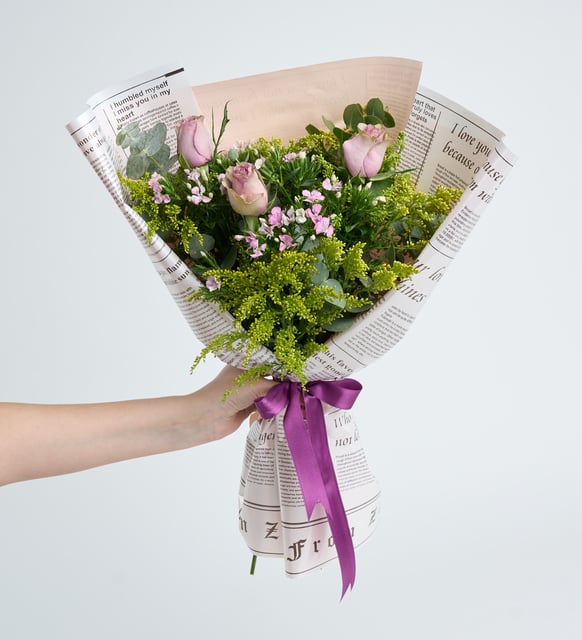 Pembe Gazete Bukette Hüsnüyusuf ve Lila Güller