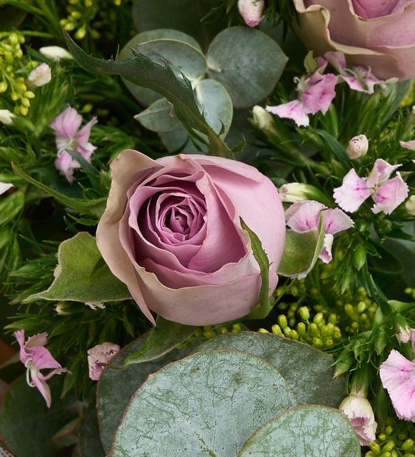 Lila güllerin dingin tonu, Hüsnüyusuf’un zarif dokusuyla buluştuğunda ortaya, gündelik anların üzerine bir sükûnet örtüsü gibi serilen bir güzellik çıkar. Okaliptusun ferah kokusu araya ince bir esinti bırakır; solidaster, ışığın kenarında parıldayan küçük bir umut gibi eşlik eder. Pembe gazete buket kâğıdı ve mor kurdele, modern bir sessizlikle bu kompozisyonun çizgilerini netleştirir. İçinde saklı, alçak sesle fısıldanan bir cümle varmış gibi: seni düşündüğümü asla unutma.