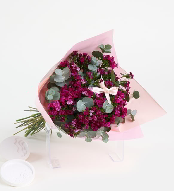 | Süsleme | Pembe buket kağıdı, açık pembe kurdele ve okaliptus yaprakları ile hazırlanmıştır. |