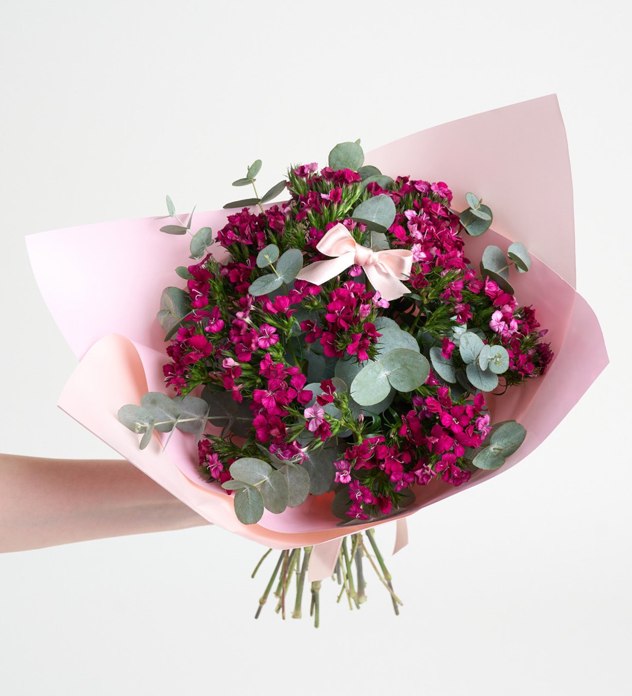 Kalbin sakin bir ritimle konuştuğu anlar olur. Hüsnüyusufların narin dokusu, açık pembe bir kurdelenin yumuşaklığıyla buluştuğunda ortaya içten ve zarif bir atmosfer çıkar. Okaliptusun ferah nefesi bu hissi berraklaştırır; pembe buket kağıdı ise tüm güzelliği zarif bir çerçeve içinde toplar. Romantizmi abartıya kaçmadan taşıyan, ince bir duygu dili.