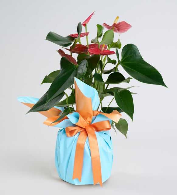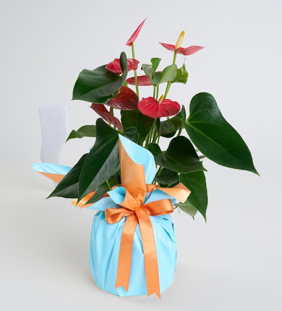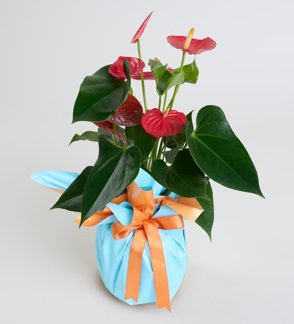 Kırmızının nabzı, sakin bir ritimle mekâna yayılıyor. Antoryumun parlak yaprakları uzun ve zarif çizgiler halinde yükselirken turuncu ile mavinin modern uyumu, tasarıma diri bir enerji katıyor. İnce bir turuncu kurdele, bütün kompozisyona son bir dokunuş gibi eşlik ediyor. Mat ve çağdaş polimer saksı, tüm bu canlılık karşısında yalın bir denge noktası: sağlam, sade, kusursuz.