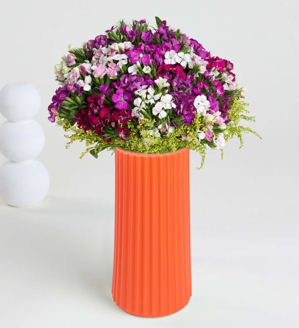Turuncu Çizgili Polimer Vazoda Rengarenk Hüsnüyusuflar