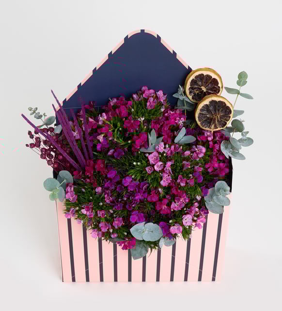 Mektup biçimli kutu, duygulara ayrılmış bir alan. Renkler bir araya geldiğinde, nazik bir teşekkürün, içten bir özrün, kalpten bir kutlamanın sessiz eşlikçisi olur. Kısa bir notun sade dokunuşu, çiçeklerin arasından usulca duyulur.