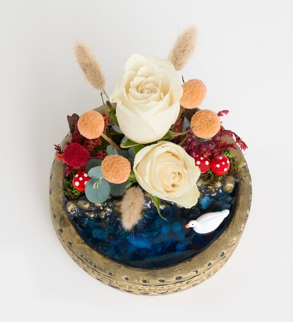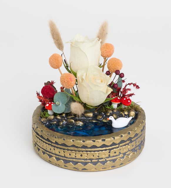Ring Saksıda Beyaz Gül ve Craspedia Teraryum