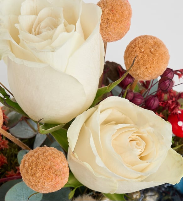 Mat bir halka formunda saksının sakin çizgileri, taşın serinliğini mekana taşıyor. İçeride beyaz gülün dingin ışığı, kırmızı ve somon tonlarındaki craspedia ile zarif bir ritme dönüşüyor; mor luna ve bej lagurus dokunuşları kompozisyona yumuşak bir tanelilik katarken okaliptusun ferah nüansı dengeyi tamamlıyor. Oasis dokusu, görünmez bir zemin gibi bütünlüğü koruyor.