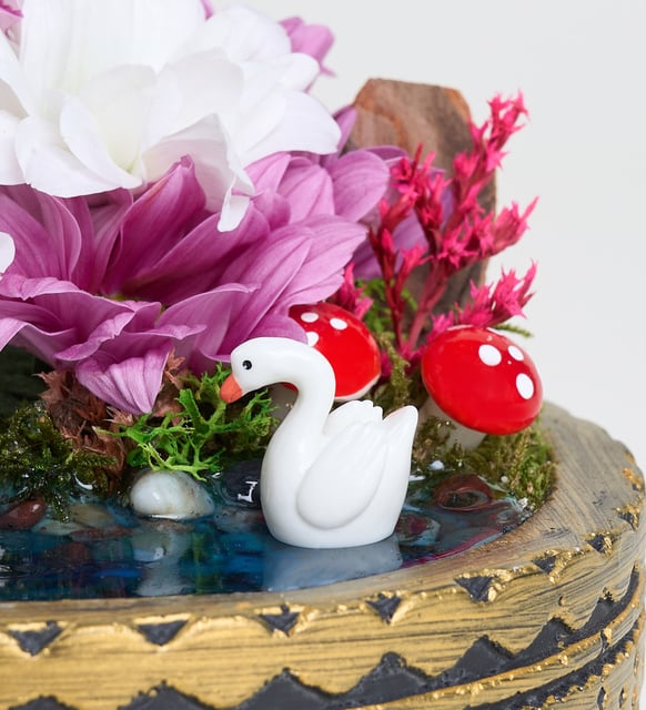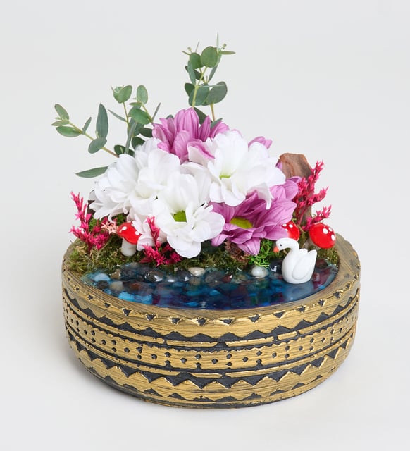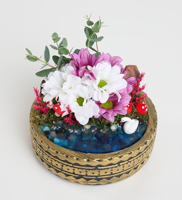 Sabahın erken saatlerinde açılan bir pencere gibi, beyaz ve pembe papatyalar sessizce içeriye baharı taşır. Okaliptusun dingin yeşili, taze bir nefes gibi aralara sızar. Taş tozu, beton ve kompozit karışımından ring formundaki saksı, bu küçük dünyayı zarif bir çerçeveye alır. Çakıl ve kumun yalın dokusu, yosunun yumuşaklığı, mum jel ile verilen su ışıltısı ve kuğu figürünün sakin duruşu, doğanın huzurlu bir anını içeride tutar. Tatarika, mantar ve ağaç kabuğu ile beyaz ve mor yapay bitkiler, tonları birbirine bağlayan ince bir ritim yaratır.
