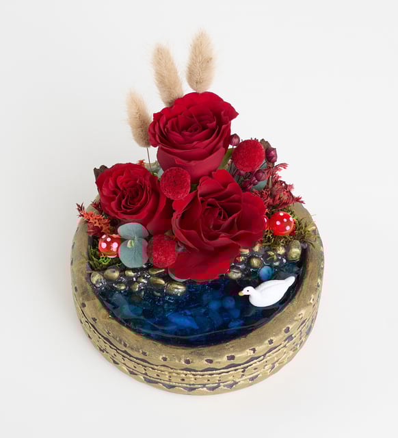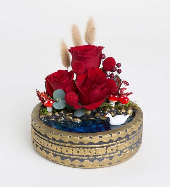 Ring Saksıda Kırmızı Gül ve Craspedia Teraryum