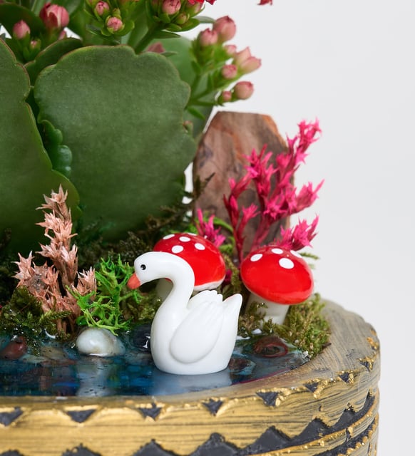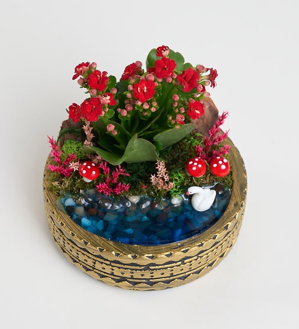 Bir halkayı andıran saksının dingin hatları içinde, kırmızının sıcak nefesi usulca yayılır. Mini kalanchoe çiçekleri, küçük bir manzaranın nabzı gibi; çakıl taşları ve kum, mum jelinin saydam yüzeyiyle birlikte suyu çağrıştırır. Kuğu figürü masalsı bir duraksama yaratır; mantar, tatarika ve yosun katmanları doğanın yavaş ritmini fısıldar. Beyaz ve mor yapay bitkilerin serin dengesi, ağaç kabuğunun rustik dokusuyla buluşur. Sessiz bir uyum, davetsiz bir huzur.