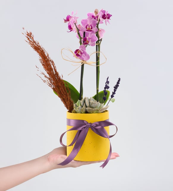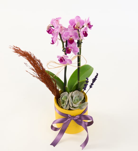 Sarı saksı, ışıkla temas ettiğinde orkidenin morunu sıcak bir aura içinde taşır. Sukulentler, bu parlaklığın yanına sessiz bir sadelik koyar; birlikte, gündelik anlara hafif bir zarafet, mekana derin bir nefes getirir.
