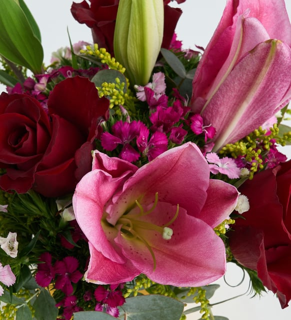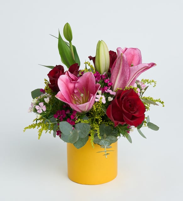 Sarı beton saksının sıcak ve sakin yüzeyi, pembe lilyumların zarif nefesiyle buluşuyor. Kırmızı güller, derin bir duygunun ritmini taşırken okaliptusun serin çizgileri ve solidasterin altın dokunuşu aranjmana dingin bir denge veriyor. Küçük bir heykel gibi, modern ve yalın. İçinde saklı bir hatırlayış, bir yakınlık hissi.