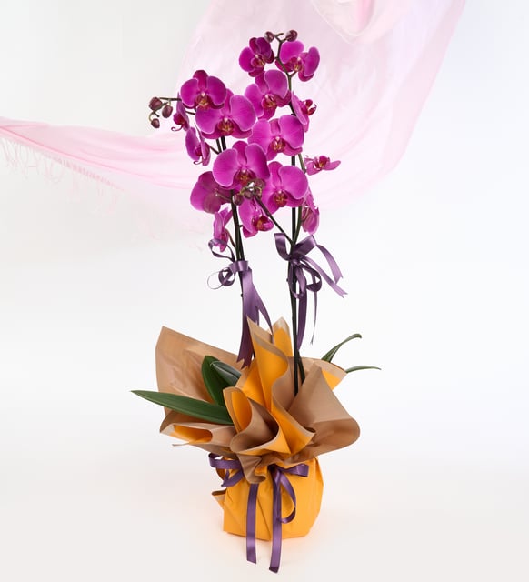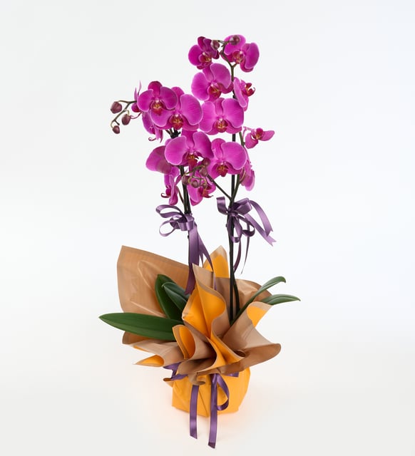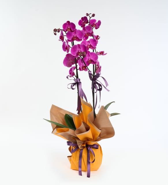 Zarif mor orkide çiçeği ile özel anlarınızı unutulmaz kılın. Bu muhteşem çiftli orkide, sarı buket kağıdı ile şık bir şekilde sunulur.