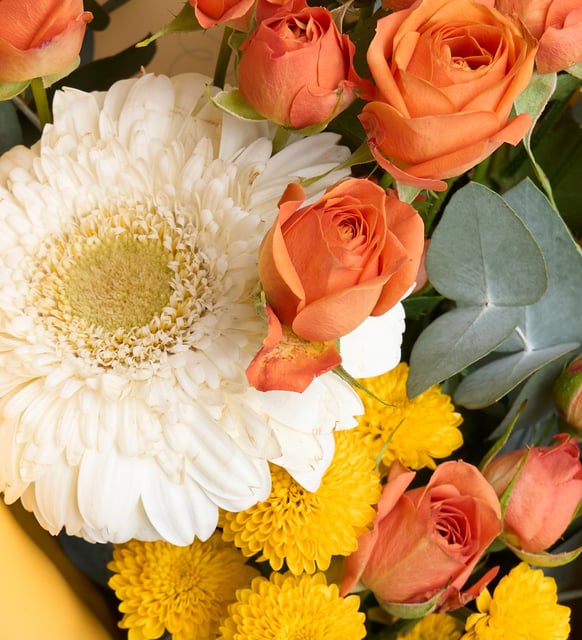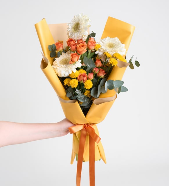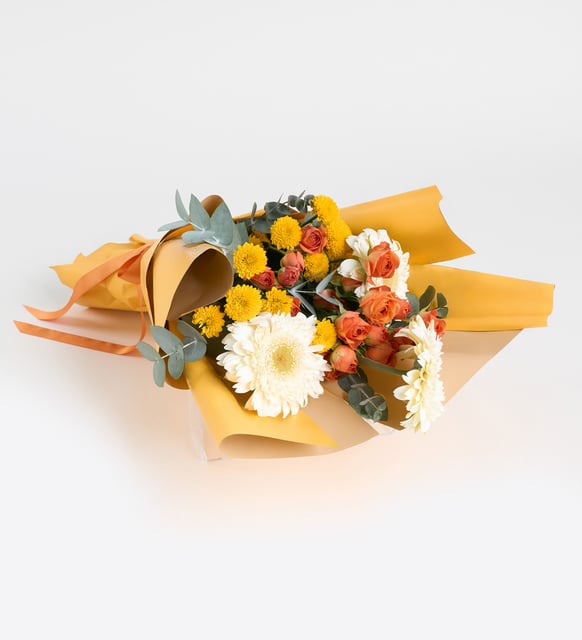 Güneşin hafifçe dokunduğu bir sabah gibi; beyaz gerberaların sakinliği, turuncu çardak güllerin içten coşkusu ve sarı krizantemlerin taze parıltısı aynı ritimde buluşur. Okaliptusun serin esintisi aralara ferah bir boşluk açar; buket, bulunduğu mekana neşeli bir aydınlık ve zarif bir sıcaklık taşır. Sarı buket kağıdı ve turuncu kurdele detayı, modern ve samimi bir görünümle kompozisyonu tamamlar.