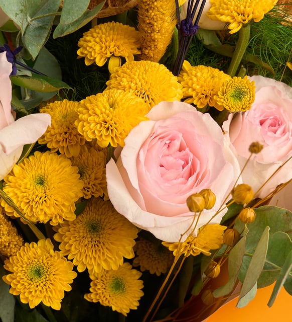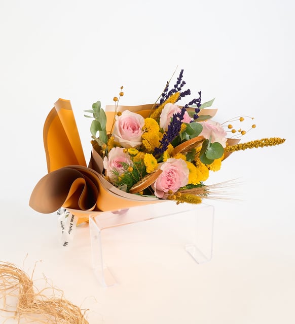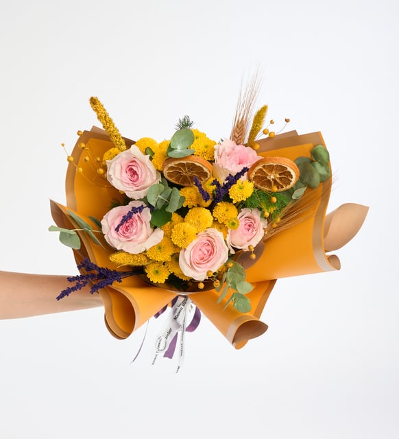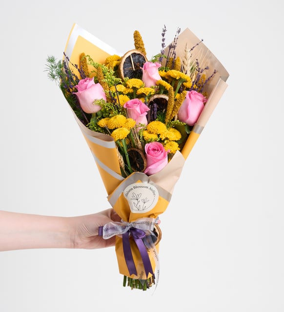 Nazik bir sabahın yumuşak ışığını anımsatan bir kompozisyon. Pembe güller, dingin bir şefkat duygusunu taşırken, sarı top kasımpatı sıcak bir neşe yayıyor. Kurutulmuş limonun narenciye dokunuşu ferahlığı fısıldıyor; lavanta ve mirkeladus ise huzurlu bir sakinliğe davet ediyor. Solidaster ve sarı setaria ince dokularla hacim kazandırırken, başak buğdayı bereket ve yeni başlangışların usul melodisini ekliyor. Sarı buket kağıdı ve mor kurdele, bütün bu hissi rafine bir finale bağlıyor.