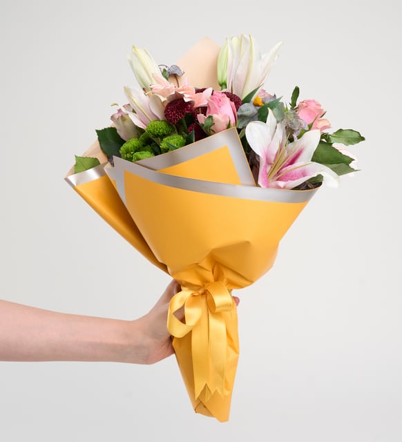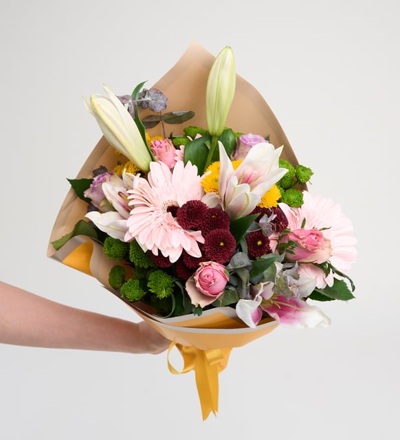 Sarı buket kâğıdının sıcaklığı, pembe tonların yumuşak sükûnetiyle buluşuyor. Bir sabah ışığı gibi açılan pembe lilyumlar, yanında dingin pembe güller ve neşeli pembe gerberalar. Lila güller aranjmana zarif bir asaleti fısıldarken, yeşil, bordo ve sarı top krizantemler renklerin küçük dokunuşlarını ekliyor. Okaliptus dalları hafif bir serinlik, temiz bir nefes bırakıyor.