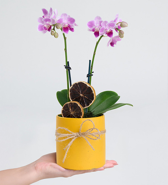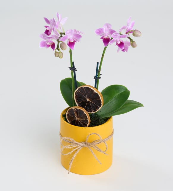 Sarı Saksıda Çiftli Mini Mor Orkide Çiçeği