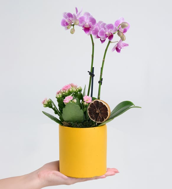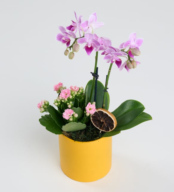 Morun dinginliği ve pembenin sıcaklığı, sarı beton saksının sade yüzeyinde buluşuyor. İki narin dal üzerinde yükselen mini orkide, sessiz bir zarafet hissi taşırken; pembe kalanchoe, minik çiçekleriyle yumuşak bir sevinç ekler. Kurutulmuş limon ve yosun, aranjmana doğadan bir nota katıp kompozisyonu tamamlar. Evde ya da çalışma alanında, günün ritmini hafifleten sakin bir duruş.