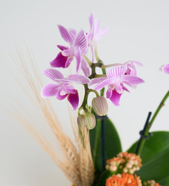 Sarı bir beton saksının sıcak yüzeyinde, mor orkidenin zarif dinginliği turuncu kalanchoe’nun canlı neşesiyle buluşur. Yan yana durduklarında bir günün iki anını anımsatır: akşamüstü moru ve öğle güneşinin sıcak tonu. Aralarında başak buğdayının doğal çizgisi, yosunun yumuşak dokusu ve toprağın sade güveni, küçük bir peyzaj gibi.