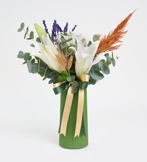 Beyaz lilyumların zarif açılışı, odanın ışığını yumuşak bir perde gibi taşıyor. Yeşil çizgili polimer vazo, dinginliğini koyu yeşil kurdeleyle tamamlıyor. Sarı yaldızlı kurdele detayı ışığa dönük küçük bir parıltı gibi, aranjmanın sakin ritmini hafifçe yükseltiyor. Okaliptusun ferah nefesi, mirkeladusun zarif çizgileri, başak buğdayların doğal dokusu ve pampasın ipeksi duruşu, lavantanın huzurlu kokusuyla birbirine karışıyor. Sonuç, saf ve incelikli bir an duygusu.