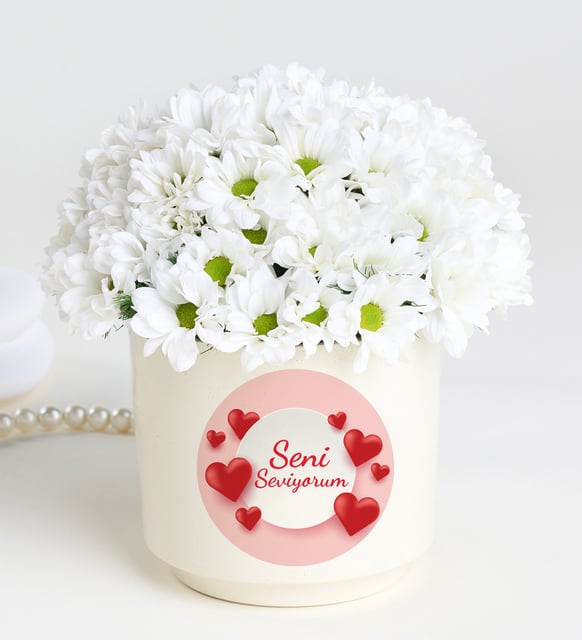 Seni Seviyorum Mesajlı Saksıda Beyaz Papatyalar