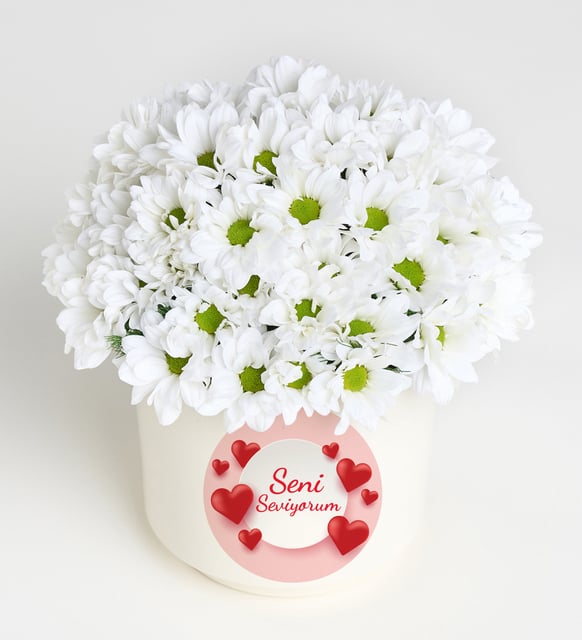 Bembeyaz bir itirafın en sakin hali. Papatyaların taze nefesi, mirkeladusun ince yeşil çizgileriyle dengelenir; beyaz polimer saksı, bu yalın duyguyu sessiz bir çerçeveye dönüştürür. Üzerindeki Seni Seviyorum ifadesi yüksek sesle söylemez, yakın bir fısıltı gibi kalbe dokunur.