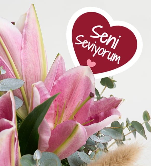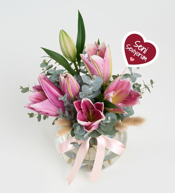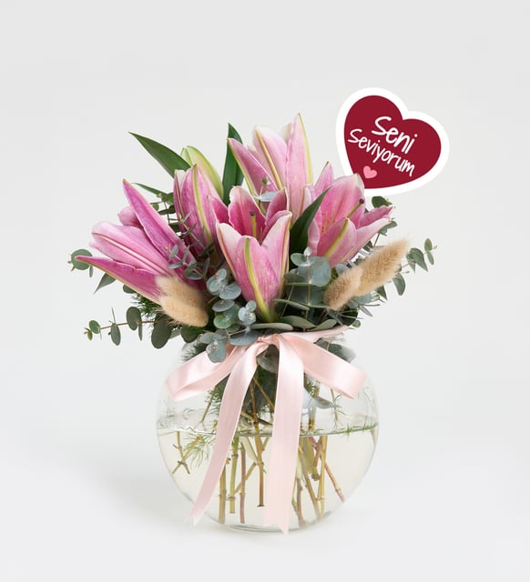 Pembe lilyumların yumuşak ışığı, cam akvaryumun berraklığında sakin bir duyguya dönüşür. Okaliptusun serin nefesi ve bej lagurusların doğal dokusu, açık pembe kurdelenin zarif bir fısıltısıyla bir araya gelir. “Seni Seviyorum” pankartı, sözü gereksiz yere büyütmeden, kalbin en sade halini taşır; içten, temiz, gönülden.