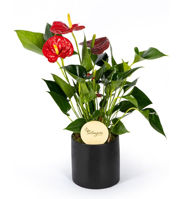 Antoryum, siyah beton saksının dingin çizgisinde. Parlak yaprakların kıvrımı, evin ritmini yumuşatır; mutluluğu, bereketi ve misafirperverliği fısıldayan bir duruş. İçinde tutkulu aşkın saklı sıcaklığı, odada uzun süre kalan bir iz gibi.