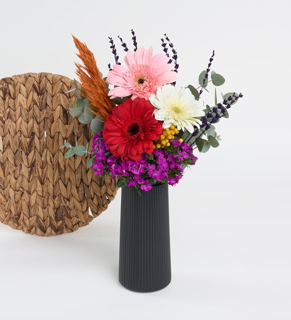 Siyah çizgili vazoda renklerin yumuşak bir sohbeti… Kırmızı gerbera içten bir sıcaklığı, beyaz gerbera dingin bir açıklığı, pembe gerbera nazik bir yakınlığı taşır. Sarı luna küçük bir güneş gibi aralara sızar; hüsnüyusufun klasik zarafeti derinlik katar. Pampas otunun tül hafifliği, okaliptüsün serin nefesi ve lavantanın ince kokusu bir arada sakin bir canlılık yaratır. Bu düzen, bulunduğu mekana sessizce yerleşir ve sanki her anın yanında olma duygusunu fısıldar.