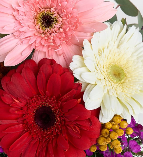 Siyah Çizgili Polimer Vazoda Kırmızı, Beyaz, Pembe Gerbera