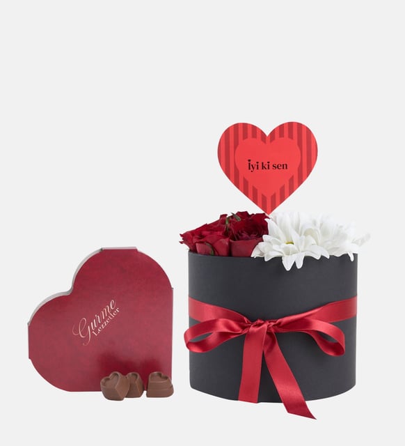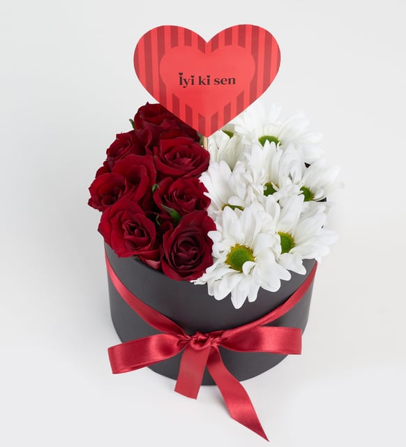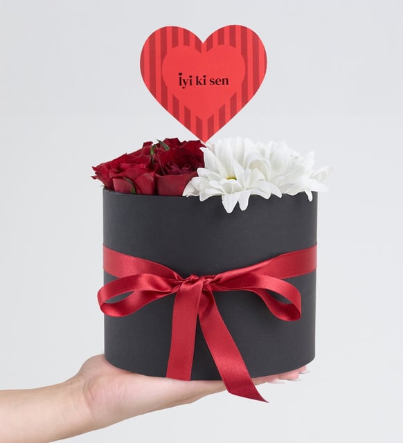 Mat siyah bir silindirin içinde derin kırmızının sıcaklığı, yanında beyazın serin dinginliği. Gül tutkunun odasını ısıtırken, papatya alanı hafifletir; geceyle sabah aynı kompozisyonda buluşur. Üzerindeki İyi ki Sen pankartı, yüksek sesle söylenmeyen bir minnet cümlesi gibi, duyguyu sade bir işaretle taşır. İçteki çiçek süngeri bu buluşmayı daha uzun süre korur; her bakışta yumuşak bir titreşim, her duruşta küçük bir anı.