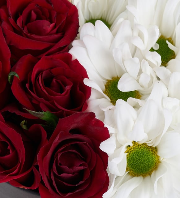 Siyah Kutuda Kırmızı Güller ve Beyaz Papatyalar