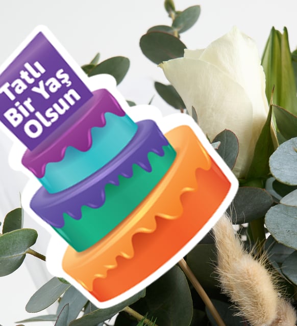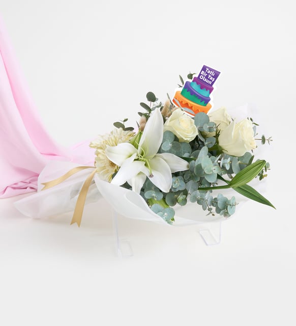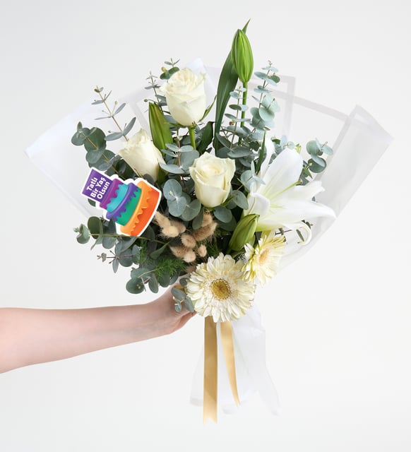 Beyazların dingin bir kutlaması: yeni yaşın sessiz sevincine eşlik eden, zarafeti fısıldayan bir aranjman. İthal beyaz güllerin yumuşak ışıltısı, lilyumların asaleti ve gerberaların masum, açık kalpli neşesi; okaliptusun serin dokunuşu ve bej lagurusların kadifemsi hafifliğiyle bir araya geliyor. Kenarı beyaz çizgili, beyaz buket kağıdı düzenin sade mimarisini kurarken, sarı yaldızlı kurdele tek bir güneş kıvılcımı gibi parlıyor. “Tatlı Bir Yaş Olsun” pankartıysa, cümleleri çoğaltmadan dile gelen bir iyi dilek.