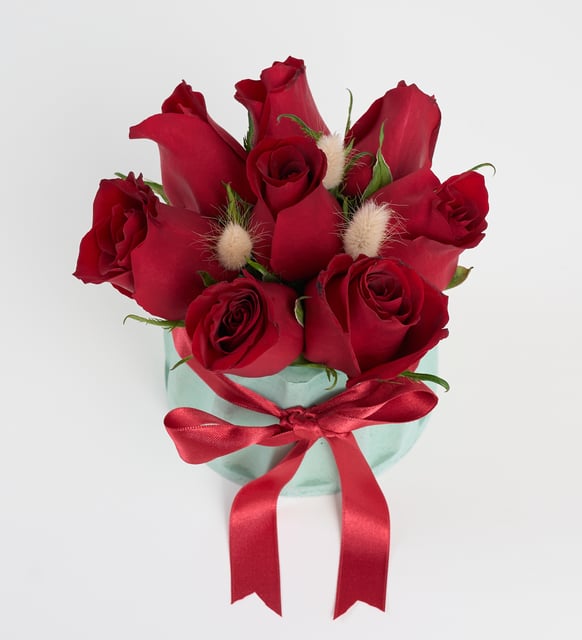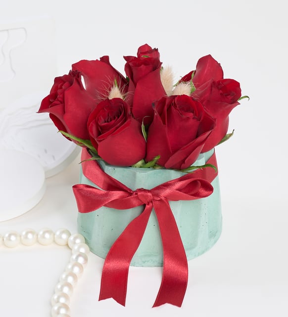 Turkuazın sakinliğiyle kırmızının sıcak nabzı, küçük bir sütun formunda buluşuyor. Mat betonun dingin yüzeyi, bej lagurusun yumuşak tüy dokusuyla hafifler; kırmızı kurdele ince bir hatıra gibi aranjmana eşlik eder. Sekiz gül, bir düşüncenin kalpte bıraktığı iz kadar berrak ve zarif.