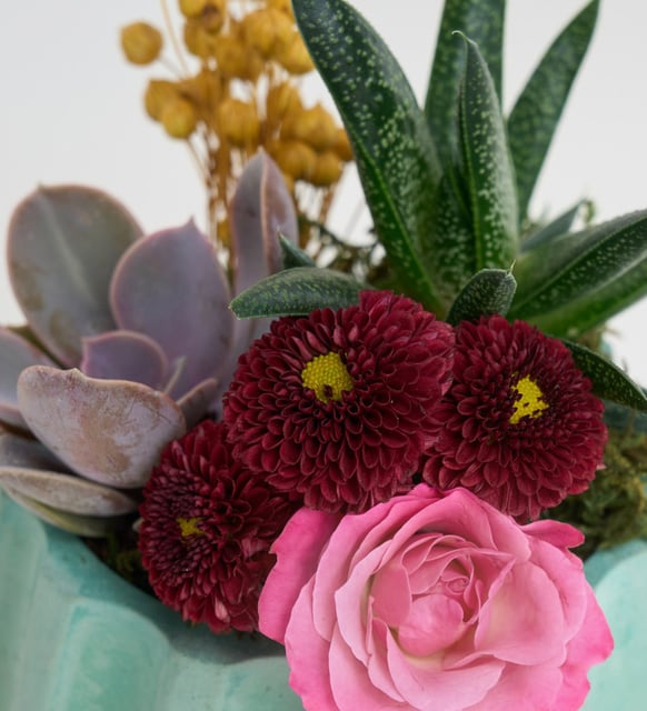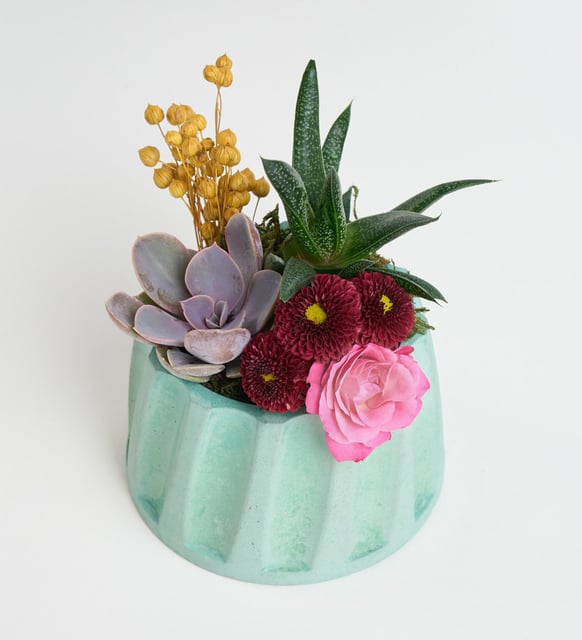 Turkuazın serin dinginliği, betonun yalın çizgileri ve sukulentlerin mimari sakinliği. Haworthia limifolia’nın ritmi, Echeveria Perle von Nurnberg’in pudramsı tonlarıyla yumuşar. Bordo top krizantem derin bir vurgu bırakır, pembe çardak gülün katmanları hafifçe açılır. Sarı luna ve yosun, aranjmanın zemnine doğal bir nefes ekler. Bir masanın köşe ışığında, kısa bir molanın sessizliğinde, kelimelere ihtiyaç duymadan anlatılan duygular gibi.