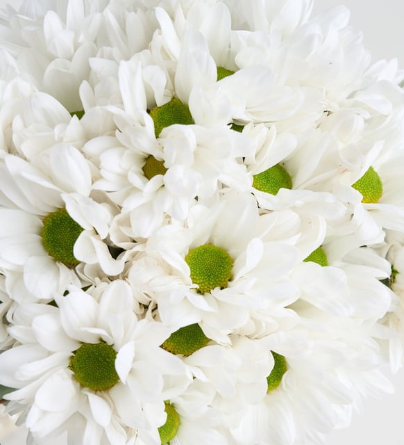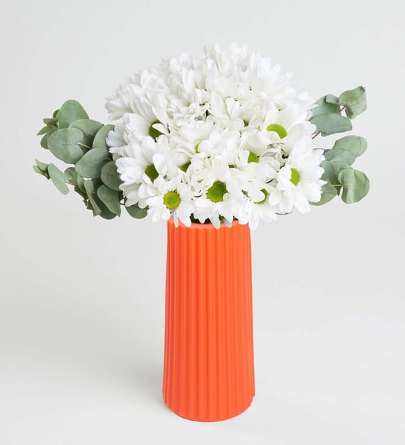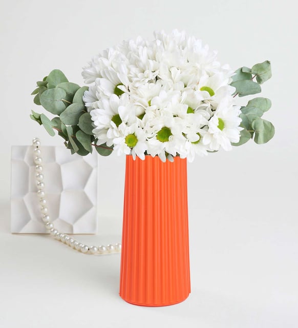Beyazın duru sessizliği, okaliptüsün serin nefesiyle buluşur; sabah ışığı gibi hafif, temiz ve içten. Turuncu çizgili polimer vazo, kompozisyona sıcak bir ritim kazandırır; modern, yalın ve zarif. Papatyaların masumiyeti, odanın içinde usul usul genişleyen bir huzur gibi; iyi haberlerin ardından alınan derin bir nefes, beklenmedik bir tebessüm.